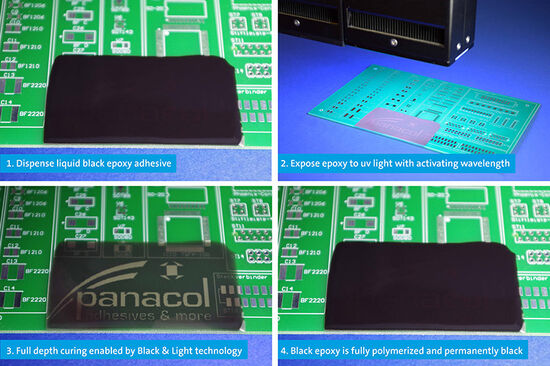 Con la nuova tecnologia "Black&Light" di Panacol, gli adesivi e le resine UV di colore nero possono ora essere polimerizzati in spessori importanti, fino a diversi millimetri mediante la sola luce UV. Durante il processo di polimerizzazione, la tecnologia innovativa "Black&Light" consente ai raggi UV di penetrare e completare la polimerizzazione in profondità. Una volta completata la polimerizzazione dell'adesivo o della resina, la struttura della tecnologia "Black & Light" si auto scurisce e impedisce la trasmissione della luce. In questo modo, gli adesivi o le resine nere ad alta densità ottica possono essere polimerizzati in un'unica fase mediante la sola luce UV. E il processo di “auto colorazione” è irreversibile.